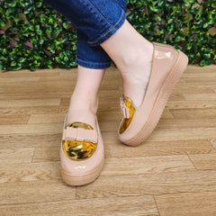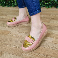 Todos los colores que puedas desear. Elegante zapato estilo mocasín, diseñado con un charol dorado combinado con otro charol del color que quieras. Cuenta con un chongo frontal.